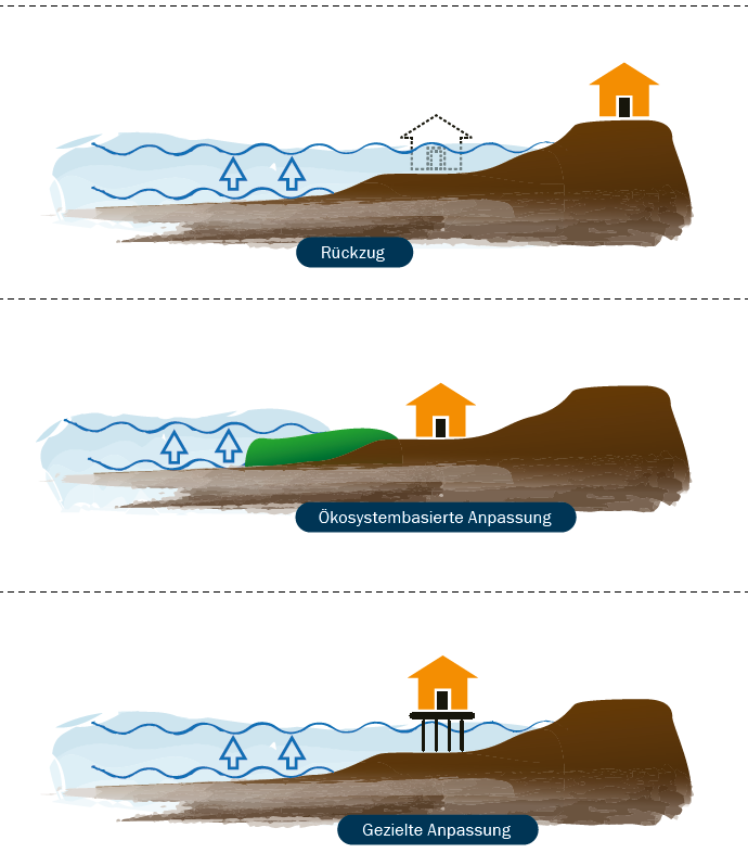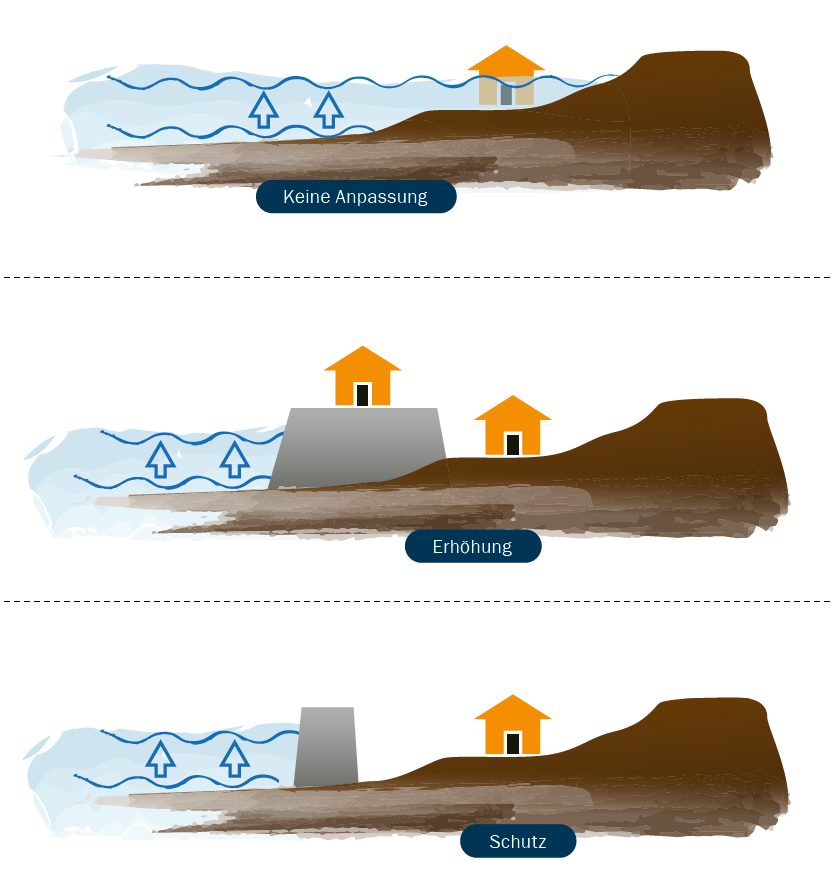 Schematische Darstellung der Anpassungsstrategien bei steigendem Meeresspiegel und verstärkten Sturmfluten. ©EUCC-D